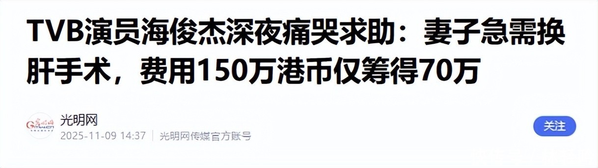 11日,香港资深艺人海俊杰通过社交媒体发布紧急求助视频,透露妻子莫家慈突患急性肝衰竭,已连续昏小时,情况危急,急需前往广州接受肝脏移植手术,预计医疗费用高万港币。